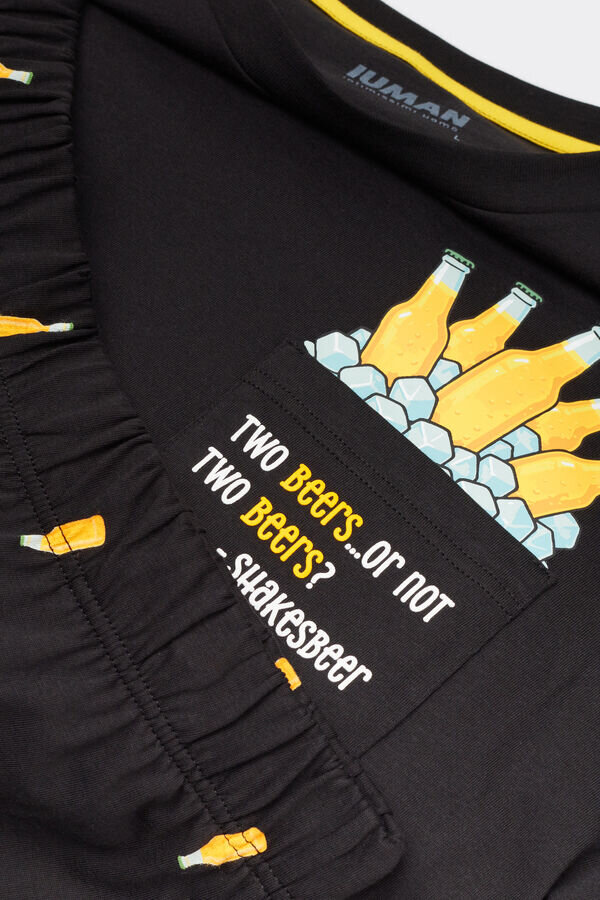 short pajamas made in cotton jersey. the solid color shirt has a pocket adorned with a fun text and a few projecting beer bottles. the shorts have an all over beer bottle print.