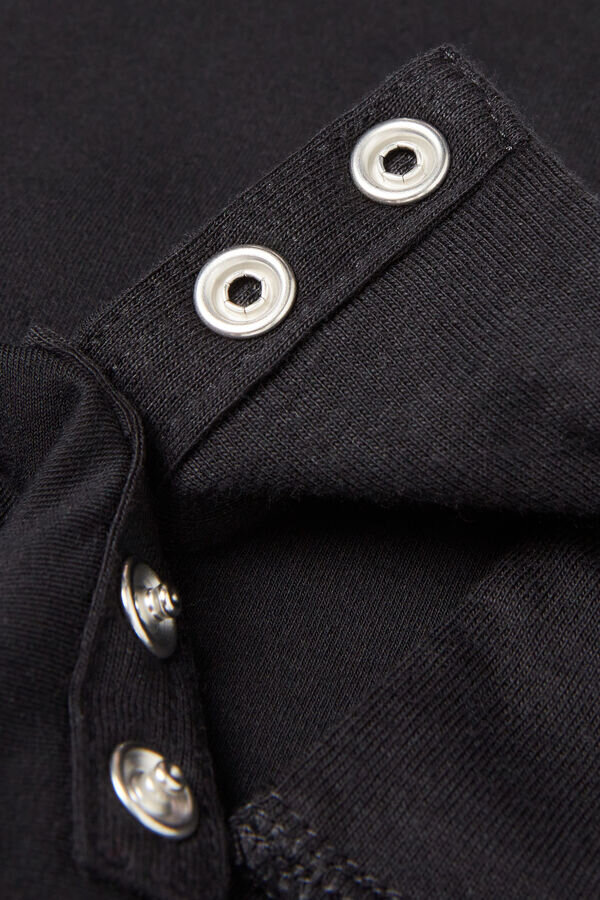 sleeveless bodysuit in raw edge 100% cotton with round neckline. snap button closure.