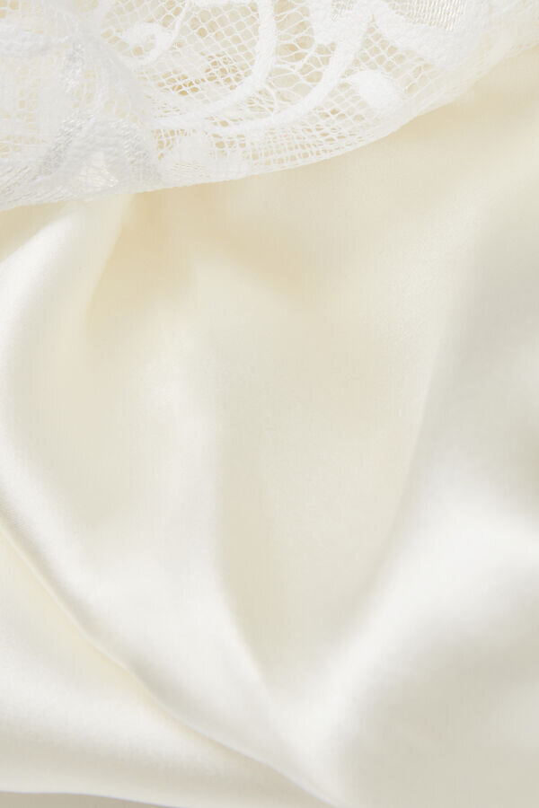 long silk satin nightgown embellished with a lace ruffle at the back and sides of the bust. sensual side slits.