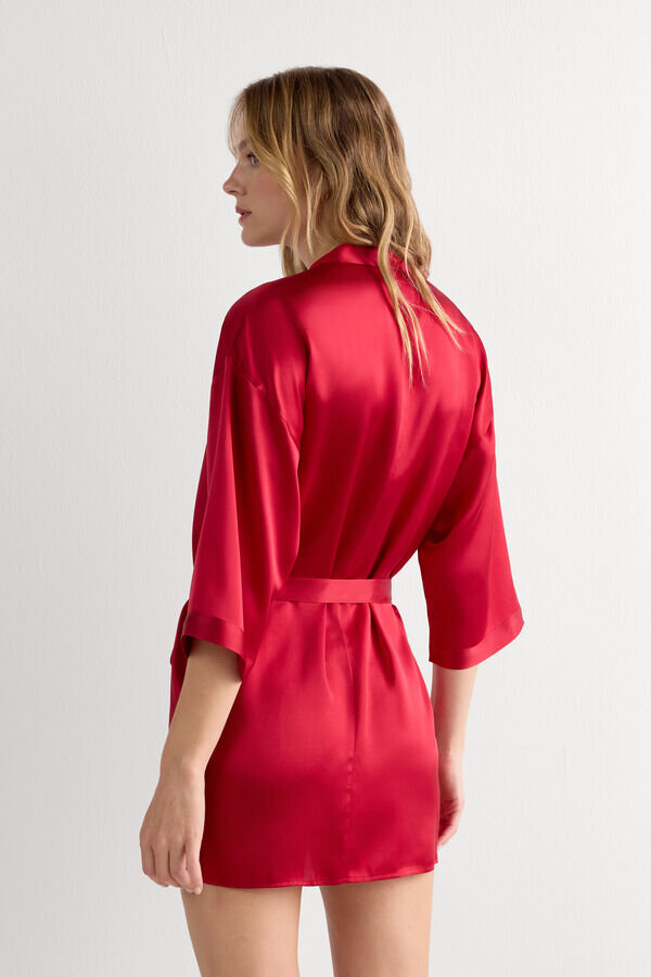 silk kimono with 3/4 sleeves. featuring inside lace-up detail to create a cross-over style and belt with two loops. the model is 5’9 and is wearing size s.
