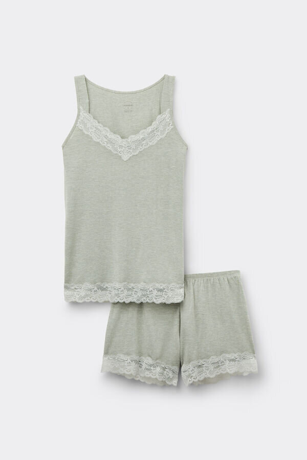 short pajamas with tank top made of soft modal with romantic lace ruffle trim.