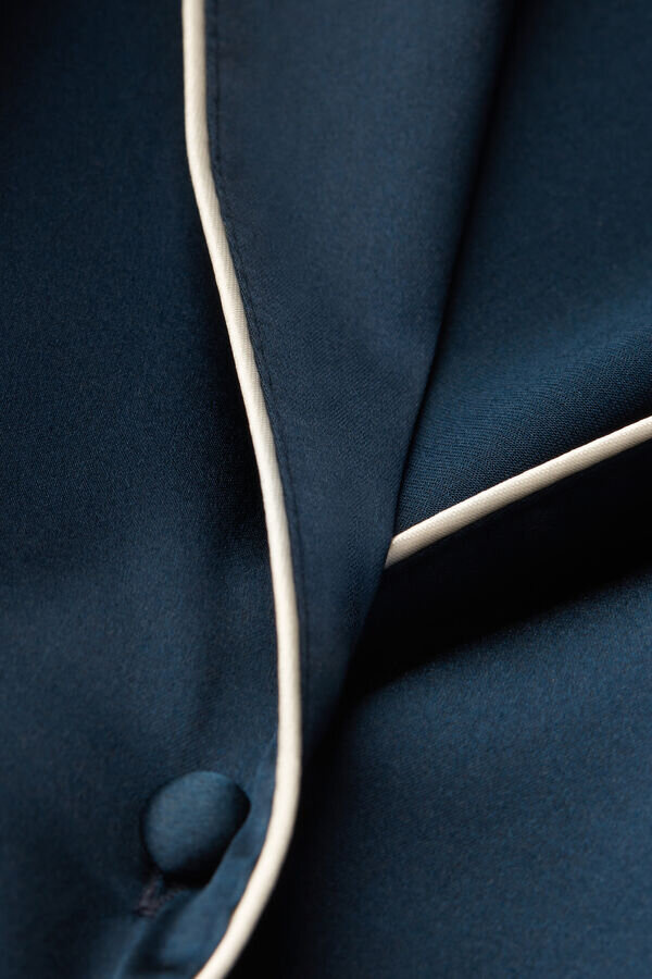 menswear cut light stretch silk satin short sleeve shirt with trim that is either tone-on-tone or in a contrasting color, depending on the color selected. elegant and comfortable, it is perfect to create a refined evening outfit, but can also be worn as a outerwear jacket with pants or jeans.