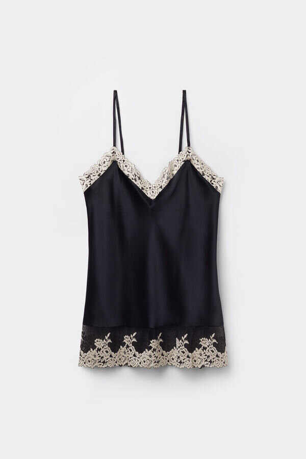 silk satin tank top with a front and back v-neck embellished with lace inserts at the neckline and hem. based on the color chosen, the lace can be of contrast color or tone-on-tone. fully adjustable, thin silk straps. regular fit.