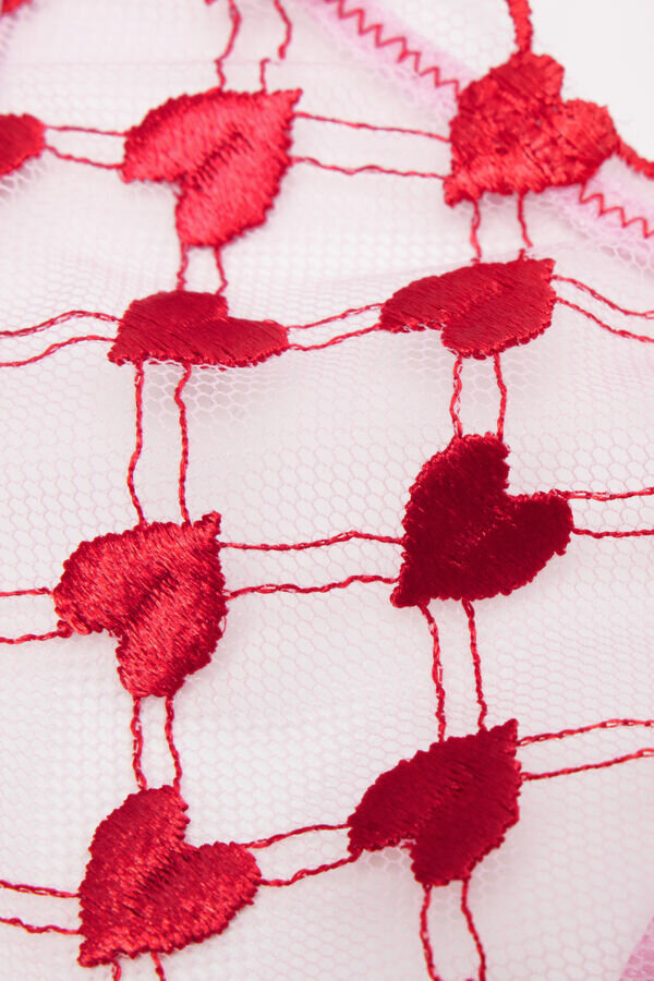 thong in romantic heart-embroidered tulle and sensual satin trim. the satin strap is removable and may be also used as a mischievous choker or hair accessory.